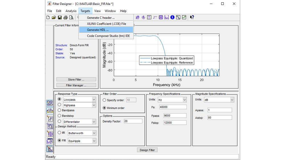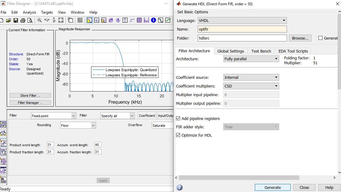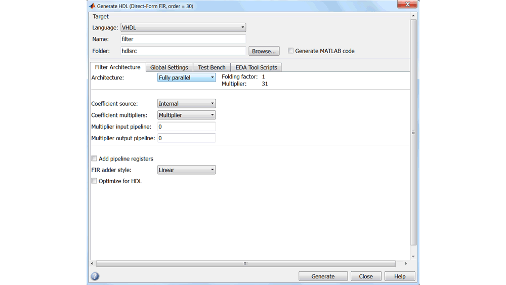 You can generate VHDL or Verilog code for fixed-point filters from either the Filter Designer app or the Filter Builder app. When generating HDL code from either app, you can set HDL generation options to specify the implementation architecture, select port data types, insert pipeline registers, and more. Other options let you generate and configure a test bench for your filter HDL design.