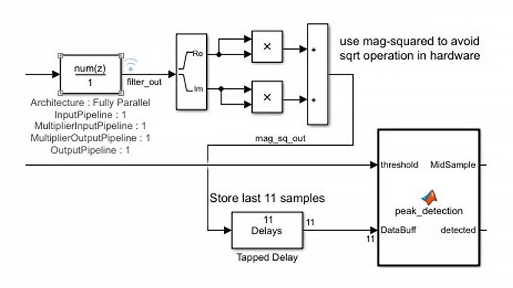 Develop algorithms that work efficiently on streaming data. Add hardware architecture details with HDL-ready Simulink blocks, custom MATLAB Function blocks, and Stateflow charts.