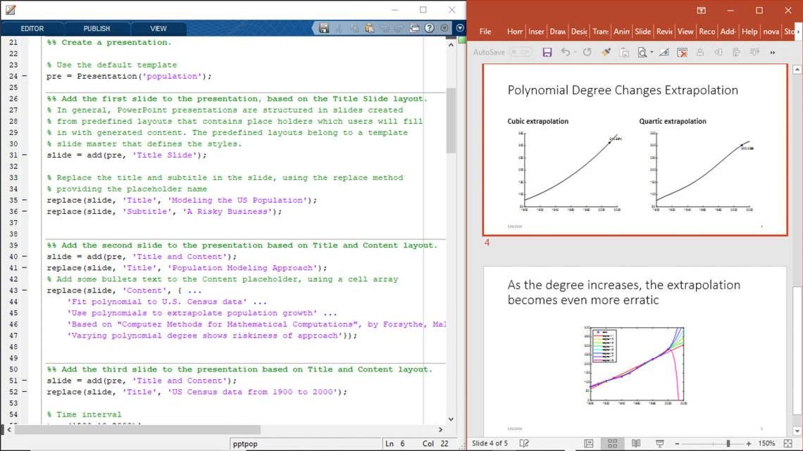 Create and update PowerPoint presentations programmatically by using the MATLAB API for PowerPoint (PPT API). Replace content and add content to existing PowerPoint presentations or generate completely new PowerPoint presentations.