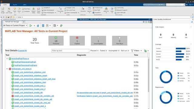 MATLAB Test provides tools for developing, executing, measuring, and managing dynamic tests of MATLAB code, including deployed applications and user-authored toolboxes. You can use the project-based quality dashboard to raise the visibility of code readiness to an intuitive summary level. The dashboard is an interactive, graphical summary of code quality metrics with clickable details for code analysis, code coverage, test results, and requirements.