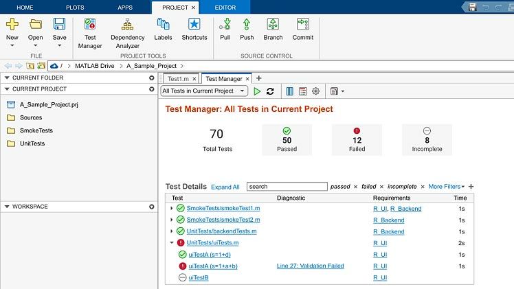 MATLAB Test manager helps you organize and manage tests and results in your project by enabling you to group, save, and run custom test suites at scale. You can identify untested code paths using industry-standard code coverage metrics, such as condition, decision, and modified condition/decision coverage (MC/DC). Persistent test results enable you to optimize productivity by only rerunning select tests to verify code edits. You can reduce test execution time of large test suites by leveraging dependency-based test selection, by running tests in parallel, or within continuous integration systems.