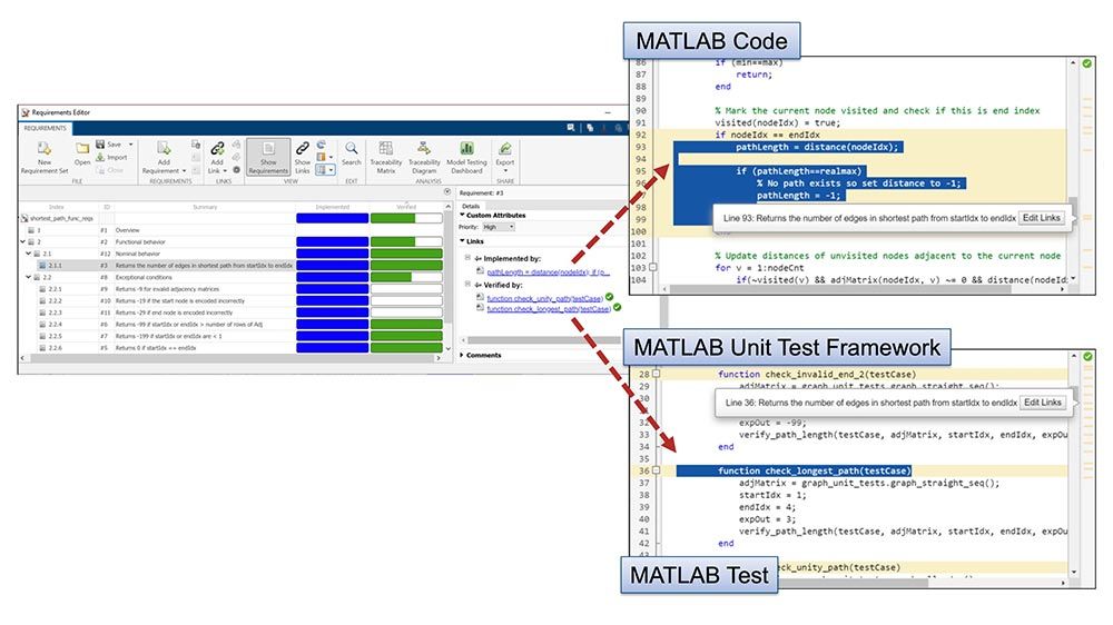 With Requirements Toolbox, create, manage, and navigate traceability links between individual lines in your MATLAB or MATLAB Test code and requirements information in external documents. Highlight traceability in the MATLAB editor to identify gaps in implementation or testing.