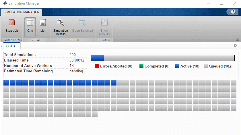 Simulation manager is integrated with parsim and can be used to monitor and visualize multiple simulations in one window. You can select an individual simulation and view its specifications, as well as use the Simulation Data Inspector to examine simulation results. You can also conveniently run diagnostic tasks or abort simulations.