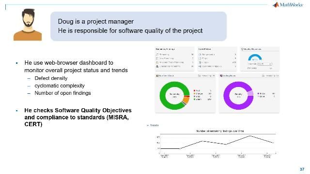 The web interface lets developers and quality engineers collaborate across projects on static code analysis results. From project dashboard to finding details, team members can monitor quality trends and analyze, review, and assign software vulnerabilities, code metrics, critical run-time errors, and adherence to coding standards. The integration with project management tools such as JIRA enables team-based collaboration on code quality. Polyspace Access includes a central repository, hosted on-premises or cloud-based, that integrates with authentication systems such as LDAP to control access to project data.