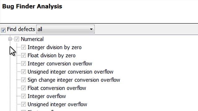 Polyspace Bug Finder checks compliance with coding rule standards such as MISRA C®, MISRA C++, AUTOSAR C++14, CERT® C, CERT C++, and custom naming conventions. It generates reports consisting of bugs found, code-rule violations, and code quality metrics, including cyclomatic complexity.