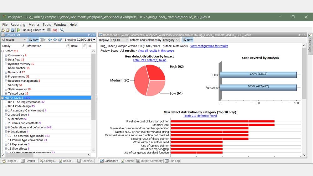 Polyspace Bug Finder identifies run-time errors, concurrency issues, security vulnerabilities, and other defects in C and C++ embedded software. Using static analysis, including semantic analysis, Polyspace Bug Finder analyzes software control flow, data flow, and interprocedural behavior. By highlighting defects as soon as they are detected, it lets you triage and fix bugs early in the development process.