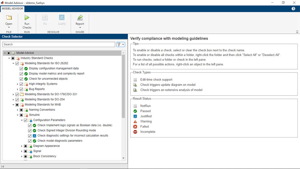 Generate Model Advisor reports for reviews. Justify violations to suppress warnings and errors. Run checks on multiple machines in parallel to accelerate compliance verification with Parallel Computing Toolbox.