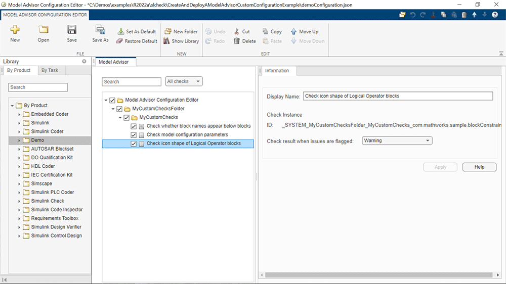 Configure, customize, and automate custom Model Advisor checks to ensure that models comply with your organization’s own standards and guidelines.