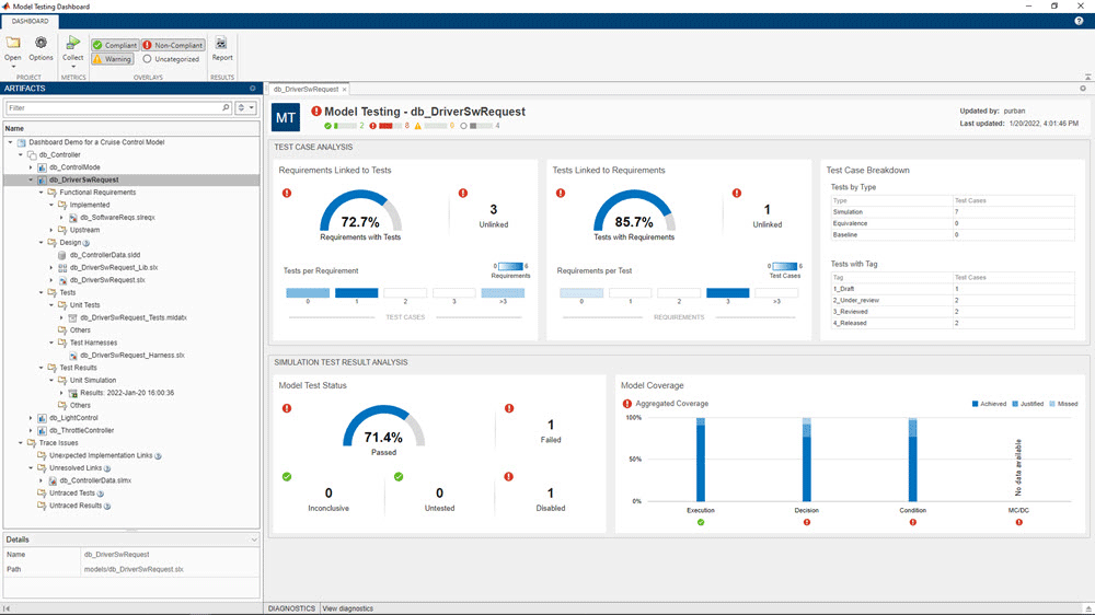 Monitor the status and quality of unit testing artifacts to assess the completeness of your requirements-based testing and comply with ISO 26262 and DO-178C standards. Assess the status and quality of your code testing for software-in-the-loop (SIL) and processor-in-the-loop (PIL) tests by using the metric results in the SIL Code Testing Dashboard and PIL Code Testing Dashboard.