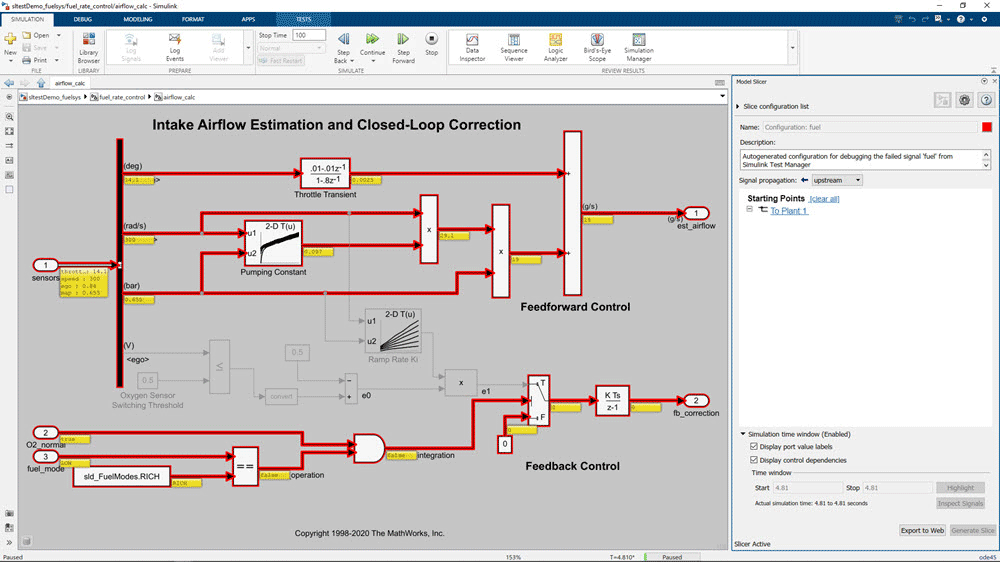 Use Model Slicer to highlight functional dependencies through a combination of static and dynamic analysis based on active behavior during simulation. Debug errors such as baseline test or equivalence test failures, property proving counterexamples, or integer overflows.