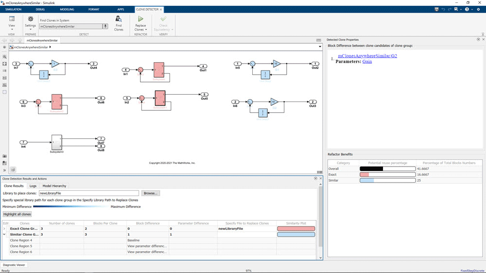 Analyze models to locate clones and duplicate modeling patterns. Automatically refactor to improve maintainability, increase reuse, and reduce design complexity. Detect inefficient patterns and refactor them for increased code efficiency.