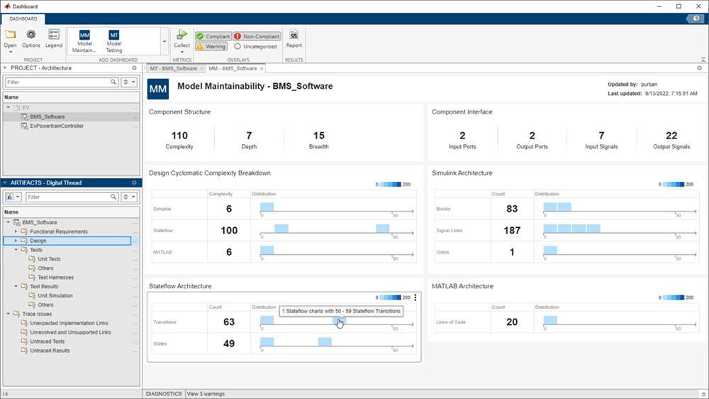 Assess your model’s size, architecture, and complexity with model metrics to help improve the readability, maintainability and reusability of your MATLAB, Simulink, and Stateflow artifacts in your project. Dashboards consolidate the metrics to help you monitor your progress towards compliance to standards such as ISO 26262, DO-178C, IEC 61508, IEC 62304, EN 50128, and other standards.