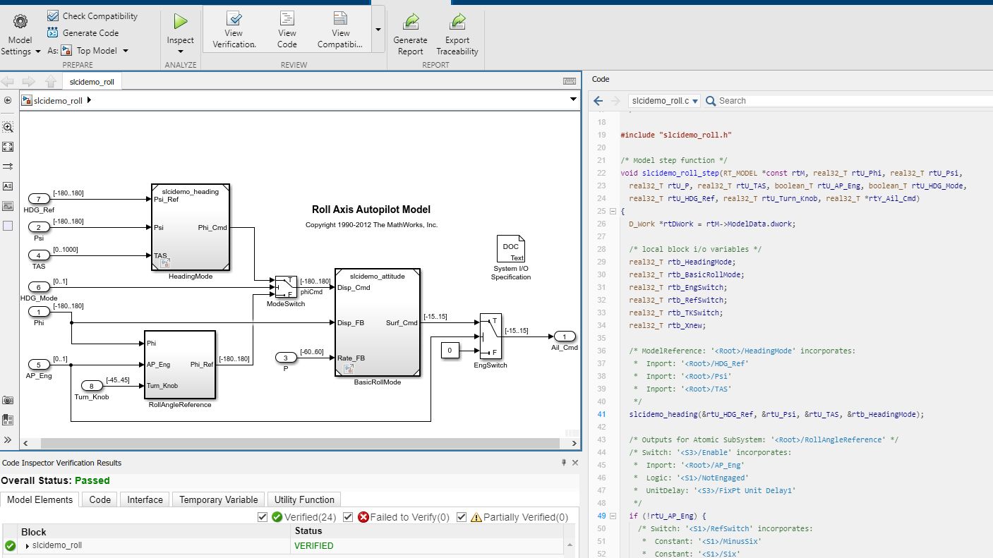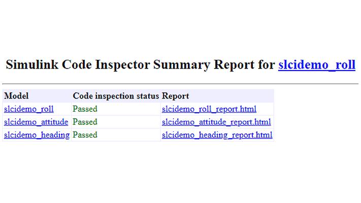 Simulink Code Inspector provides detailed model-to-code and code-to-model traceability analysis. It generates functional equivalence and traceability reports that you can submit to certification authorities to satisfy DO-178 software coding verification objectives. It includes an app that lets you check model compatibility and inspect the code. Code inspection results are displayed in the model and in the associated code.
