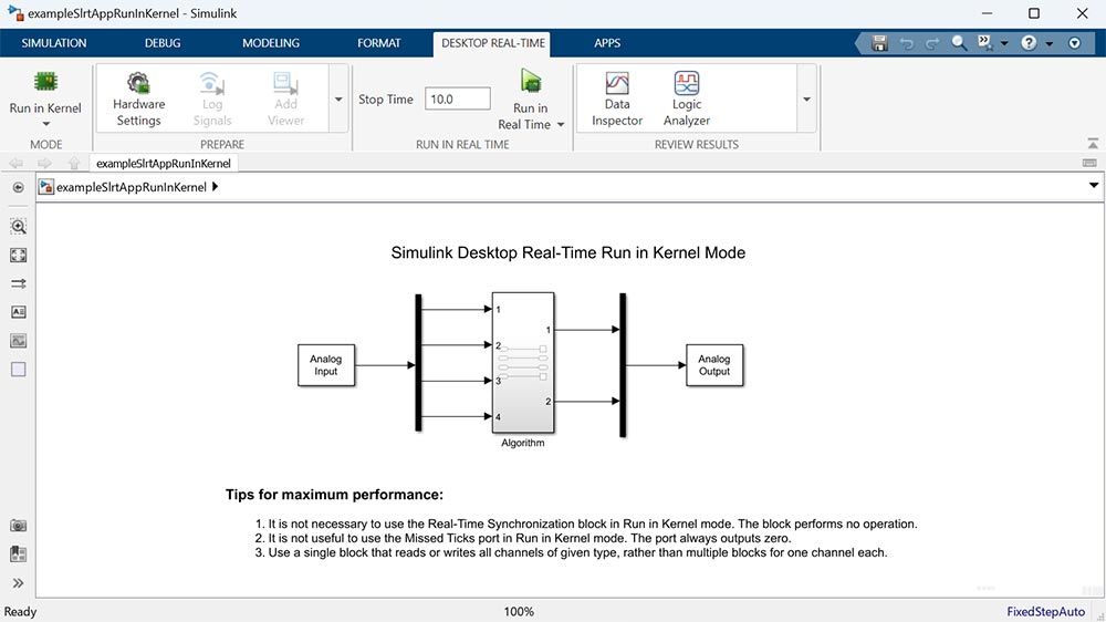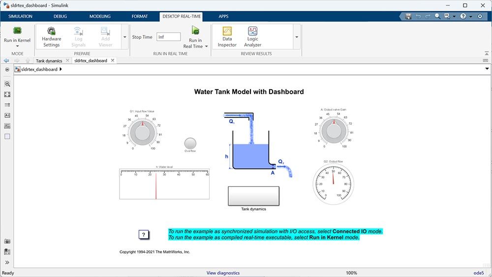 Simulink Desktop Real-Time provides a real-time kernel for Windows®, Linux®, and macOS®. It includes drag-and-drop Simulink I/O driver blocks that enable closed-loop control of physical systems from your desktop computer. The toolbox lets you connect to sensors, actuators, and other devices to prototype and test control systems without requiring dedicated real-time test equipment.
