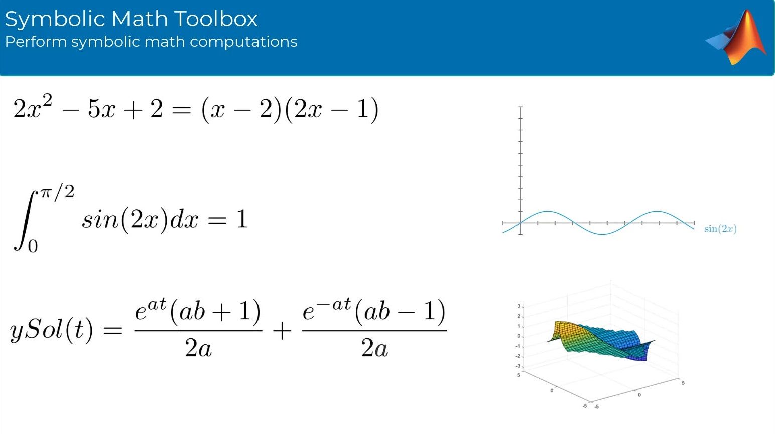 Symbolic Math Toolbox provides functions for solving, plotting, and manipulating symbolic math equations. You can create, run, and share symbolic math code. In the MATLAB Live Editor, you can get next-step suggestions for symbolic workflows. The toolbox provides functions in common mathematical areas such as calculus, linear algebra, algebraic and differential equations, equation simplification, and equation manipulation.
