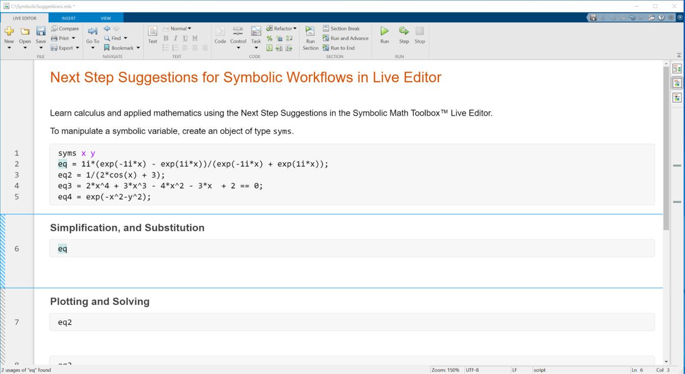 Interactively update and display symbolic math computations and get next-step suggestions for symbolic workflows using the MATLAB Live Editor. Share your work as live scripts or publish your code to create formatted documents including HTML, Word, LaTeX, and PDF.